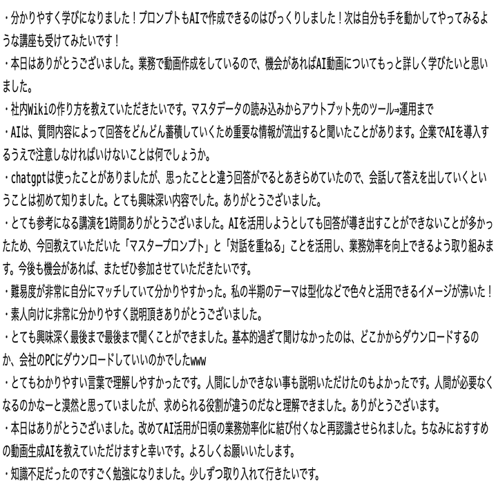 AIとは何か、使って何ができるのか、そういった欲しい情報を得られたという声が多かったです。このレベル感が、日常的な活用に直結する、ちょうどいい塩梅なんだと思います。